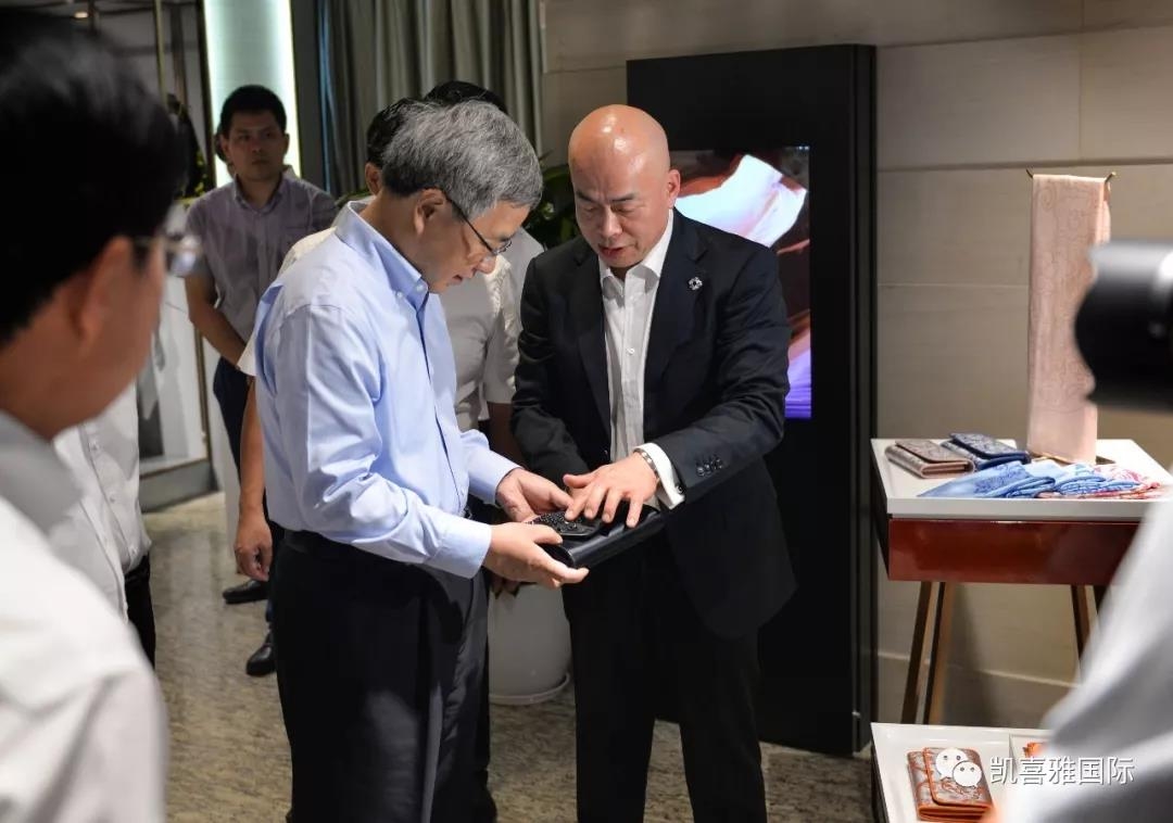 胡春華副總理、車俊書記一行參觀考察了凱喜雅絲綢體驗(yàn)中心,集團(tuán)董事長(zhǎng)張國(guó)強(qiáng)介紹了集團(tuán)在產(chǎn)業(yè)鏈建設(shè)、國(guó)內(nèi)外貿(mào)易、研發(fā)設(shè)計(jì)、品牌建設(shè)等方面的舉措與取得的成效,并介紹了凱喜雅為G20杭州峰會(huì)設(shè)計(jì)制造的國(guó)禮絲綢產(chǎn)品。胡春華副總理拿起“國(guó)色天香”真絲手包仔細(xì)端詳,表示贊賞。