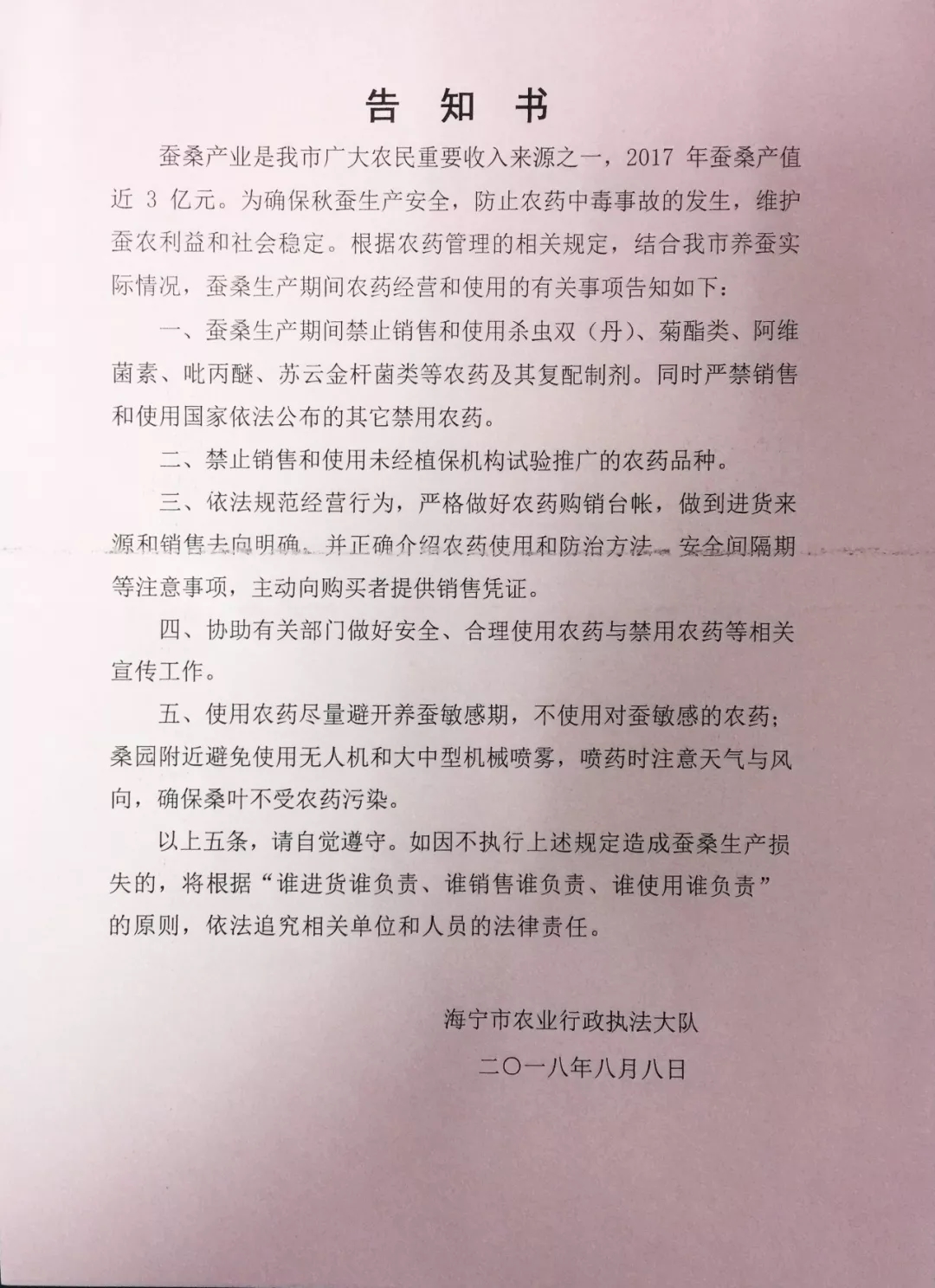 市蠶桑技術(shù)服務(wù)站結(jié)合我市養(yǎng)蠶實際情況,對農(nóng)藥經(jīng)營單位和種植大戶發(fā)放了告知書。要求各主體一是在蠶桑生產(chǎn)期間禁止銷售和使用菊酯類、阿維菌素、吡丙醚、蘇云金桿菌等對蠶敏感的農(nóng)藥;二是要安全、合理使用農(nóng)藥,做好臺賬登記,做到有據(jù)可查;三是桑園附近避免使用無人機和大中型機械噴霧防治,噴藥時注意天氣與風(fēng)向,確保桑葉不受農(nóng)藥污染。