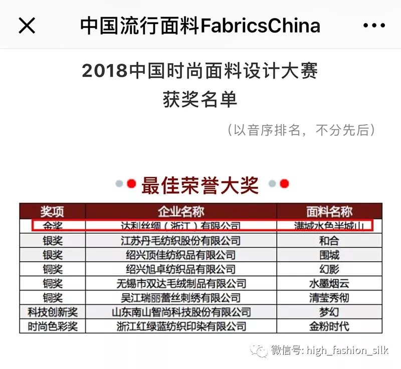 2018中國時(shí)尚面料設(shè)計(jì)大賽獲獎(jiǎng)名單出爐,達(dá)利絲綢設(shè)計(jì)師李紅梅、陳燕芳設(shè)計(jì)的“滿城水色半城山”榮獲本次大賽的唯一金獎(jiǎng)。
