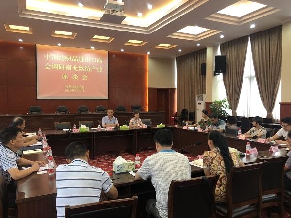 9月3日下午,調(diào)研組一行與南充地區(qū)紡織及絲綢行業(yè)主要企業(yè)代表、產(chǎn)業(yè)園負責人及相關政府部門負責同志進行了座談。出席活動的人員包括:南充市經(jīng)信委負責同志、南充市轄三區(qū)經(jīng)信局分管絲紡服裝產(chǎn)業(yè)的負責同志、南充市商糧局絲綢科負責人、高坪都京絲紡工業(yè)園、嘉陵工業(yè)園區(qū)相關負責人,嘉美印染、六合集團、富安娜、依格爾、金富春、銀海絲綢等企業(yè)負責人。