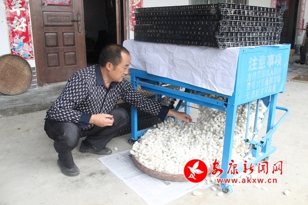 安康新聞網(wǎng)訊(通訊員 沈沙沙) “我今年養(yǎng)了20張蠶,在摘繭的時候這臺取繭機(jī)可幫了我們家的大忙。”和蔡明勇交談間,他的妻子已快速取下五六片塑框木質(zhì)方格蔟上的蠶繭,簸箕上堆滿了白花花的蠶繭。