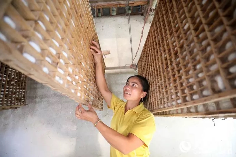 ▲蠶農(nóng)正檢查蠶寶寶結(jié)繭情況