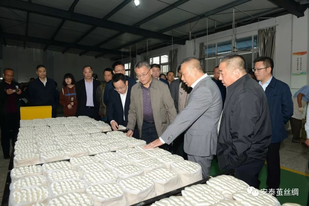 張強(qiáng)一行先后參觀了安泰公司繅絲織綢工藝生產(chǎn)區(qū)、南方絲綢博覽館,隨后深入雙星、猛山現(xiàn)代化蠶桑產(chǎn)業(yè)基地進(jìn)行現(xiàn)場(chǎng)參觀。安泰公司花園式園區(qū)環(huán)境、井然有序的生產(chǎn)現(xiàn)場(chǎng)及現(xiàn)代化蠶桑示范園給與會(huì)人員留下了深刻印象,受到了相關(guān)領(lǐng)導(dǎo)和同行的高度贊揚(yáng)。張強(qiáng)對(duì)安泰繭絲綢集團(tuán)“建一流企業(yè),創(chuàng)世界名牌,打造中國(guó)高端繭絲綢生產(chǎn)基地”的戰(zhàn)略目標(biāo)給予了高度評(píng)價(jià),對(duì)安泰繭絲綢有限公司董事長(zhǎng)唐定云提出的“土地流轉(zhuǎn)、科技助推、物資配送、金融支撐”四個(gè)機(jī)制聯(lián)合實(shí)施建設(shè)蠶桑基地的創(chuàng)新理念非常認(rèn)同,并肯定了該公司蠶桑示范基地建設(shè)的成績(jī),希望該公司繼續(xù)發(fā)揮龍頭企業(yè)的帶動(dòng)作用,加快蠶?;亟ㄔO(shè),為蠶桑產(chǎn)業(yè)發(fā)展做出更大的貢獻(xiàn)!