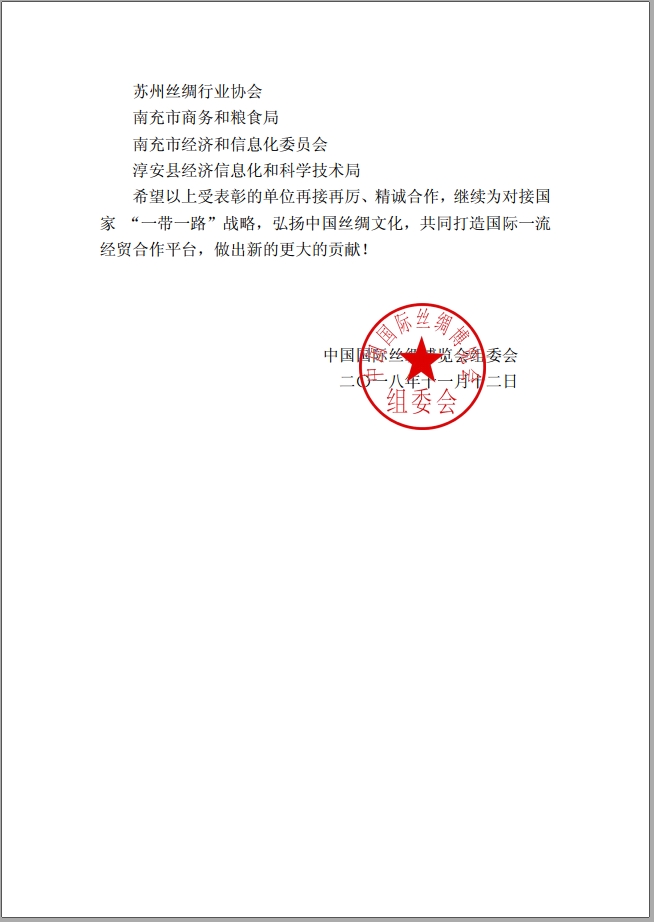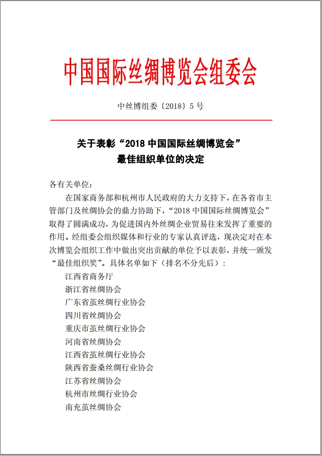 中國(guó)國(guó)際絲綢博覽會(huì)組委會(huì)《關(guān)于表彰“2018中國(guó)國(guó)際絲綢博覽會(huì)”最佳組織單位的決定》