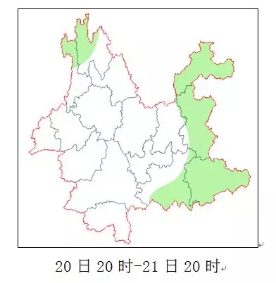 20日20時-21日20時:昭通、曲靖、文山、紅河南部、迪慶西部、怒江北部陰天間多云有陣雨,其它地區(qū)晴間多云。