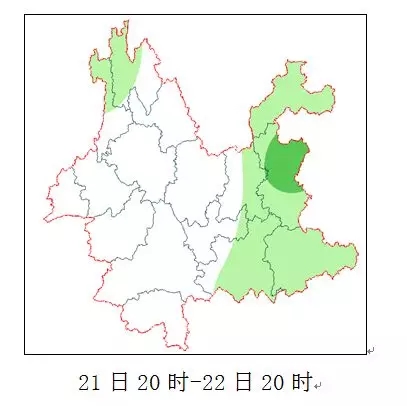 21日20時-22日20時:昭通、曲靖、文山、昆明東部、玉溪東部、紅河東部、迪慶西部、怒江北部陰天間多云有陣雨局部中雨,其它地區(qū)晴間多云。