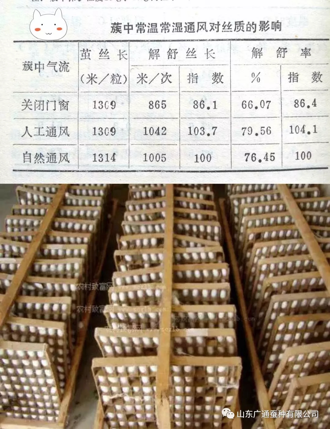 簇中保護(hù)的全期來講,排濕保溫是主要的,但不同階段的環(huán)境控制也有所側(cè)重。上簇初期,近在繭框形成之前,主要控制好溫度和光線,并防止強(qiáng)風(fēng)直吹和震動(dòng);上簇一晝夜繭框形成后,則做好通風(fēng)換氣和排濕保溫工作,對(duì)提高解舒率具有顯著作用。所以,簇中環(huán)境保護(hù)應(yīng)從提高解舒率為中心,在不同階段掌握不同重點(diǎn),以提高繭絲品質(zhì)。
