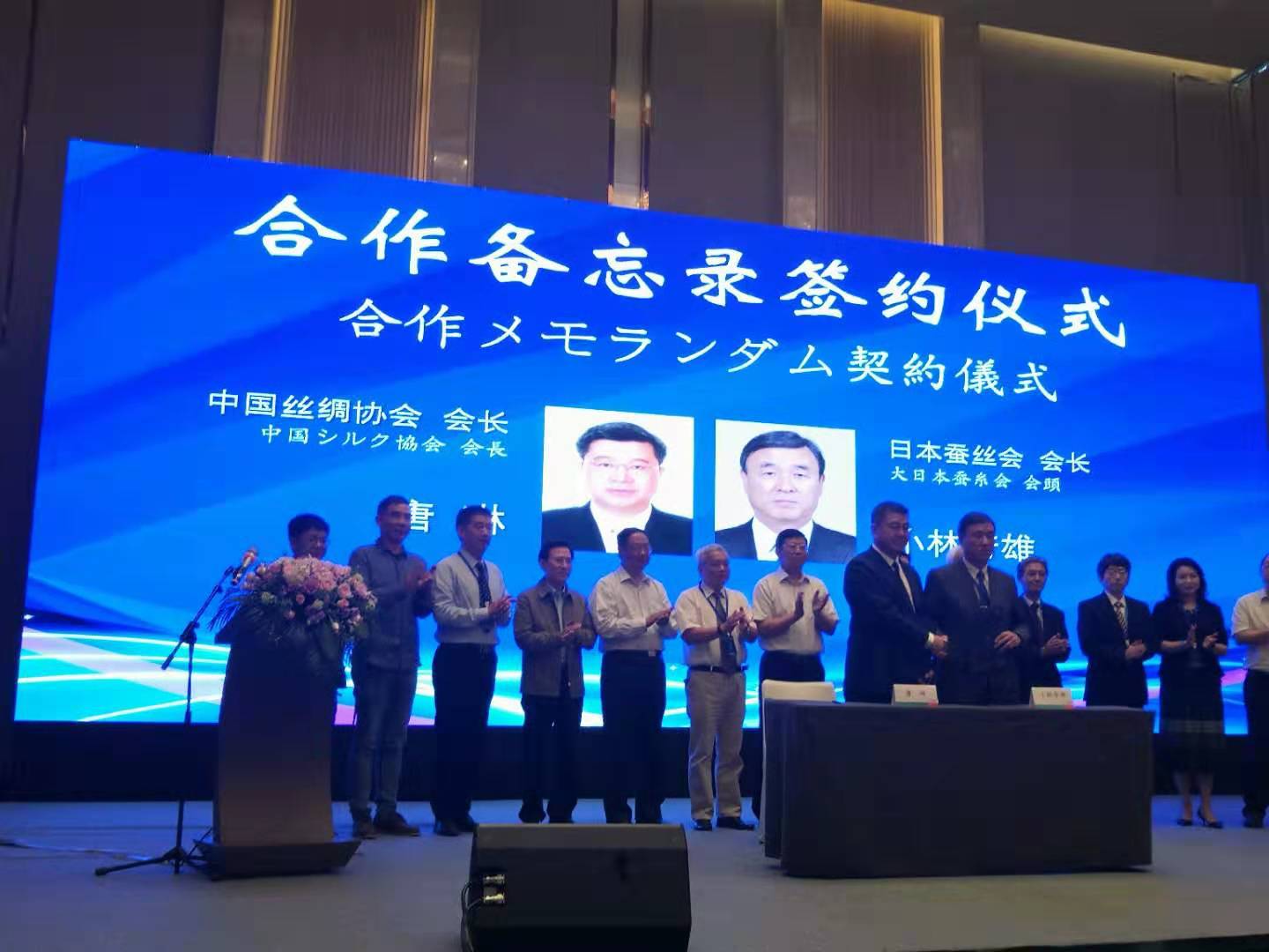 中國絲綢協(xié)會會長唐琳與日本蠶絲會會長小林芳雄簽訂合作備忘錄。