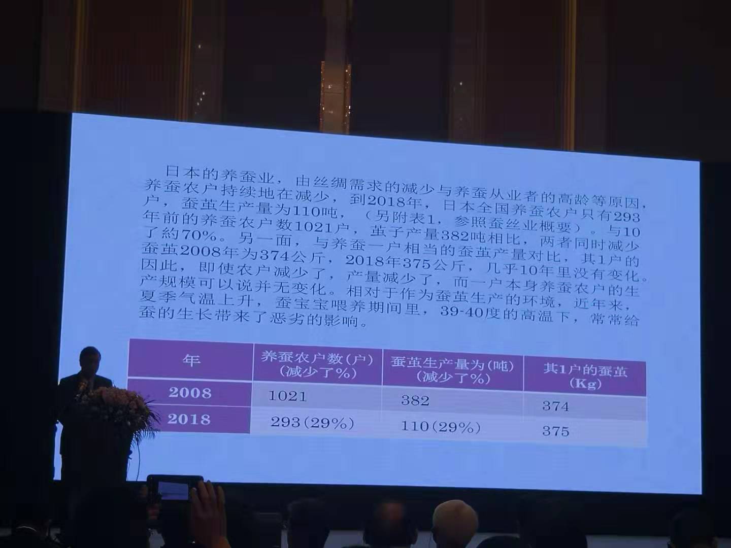日本的養(yǎng)蠶業(yè),由絲綢需求的減少與養(yǎng)蠶從業(yè)者的高齡等原因,養(yǎng)蠶農(nóng)戶持續(xù)地在減少,到2018年,日本全國養(yǎng)蠶農(nóng)戶只有293戶,蠶繭生產(chǎn)量為110噸,(另附表1,參照蠶絲業(yè)概要)。與10年前的養(yǎng)蠶農(nóng)戶數(shù)1021戶,繭子產(chǎn)量382噸相比,兩者同時減少了約70%。另一面,與養(yǎng)蠶一戶相當(dāng)?shù)男Q繭產(chǎn)量對比,其1戶的蠶繭2008年為374公斤,2018年375公斤,幾乎10年里沒有變化。因此,即使農(nóng)戶減少了,產(chǎn)量減少了,而一戶本身養(yǎng)蠶農(nóng)戶的生產(chǎn)規(guī)模可以說并無變化。相對于作為蠶繭生產(chǎn)的環(huán)境,近年來,夏季氣溫上升,蠶寶寶喂養(yǎng)期間里,39-40度的高溫下常常蠶的生長帶來了惡劣的影響。