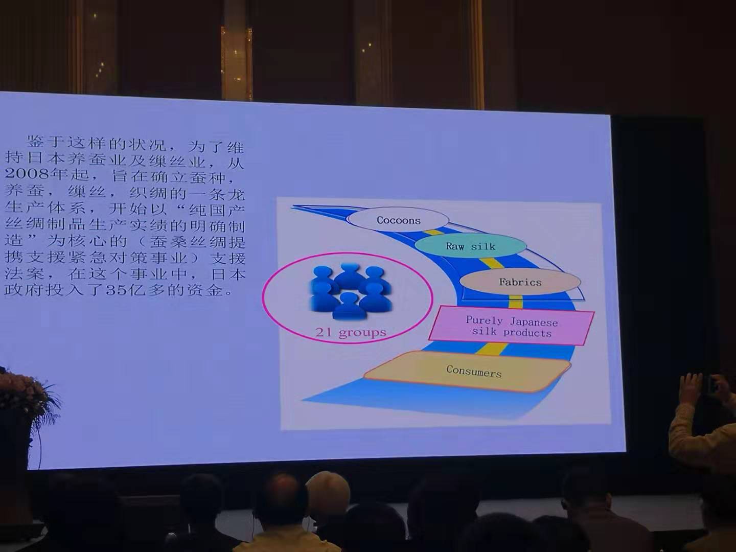 鑒于這樣的狀況,為了維持日本養(yǎng)蠶業(yè)及繅絲業(yè),從2008年起,旨在確立蠶種、養(yǎng)蠶,繅絲,織綢的一條龍生產(chǎn)體系,開始以“純國產(chǎn)絲綢制品生產(chǎn)實(shí)績的明確制造“為核心的(蠶桑絲綢提攜支授緊急對策事業(yè))支援法案,在這個事業(yè)中,日本政府投入了35億多的資金