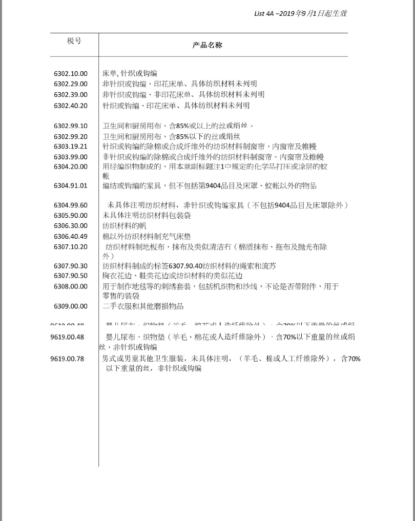 4A清單(2019年9月1日開始征收)