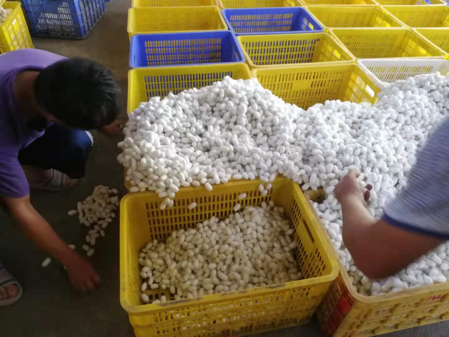 作為風(fēng)向標(biāo)的廣西河池市宜州區(qū),今日首批秋繭批量上市,昨日收到3000市斤的繭站今天能收到6000市斤。收購(gòu)主體熱情高,毛腳繭較多,收購(gòu)價(jià)格從昨日的50.4-51元居多上漲至52-54元。今日鮮繭解舒率在60%左右,估計(jì)毛折在7.9左右。在廣西河池市,上半年繭價(jià)偏低、極端天氣等原因造成的飼養(yǎng)難度大、繭張產(chǎn)下降等多種原因?qū)πQ農(nóng)生產(chǎn)積極性造成影響,再加上上半年雨水多,近期又較旱,某些低澇地區(qū)的桑園生長(zhǎng)狀況對(duì)下半年蠶桑生產(chǎn)也造成一定影響,多種因素疊加,今年宜州第一批秋蠶的飼養(yǎng),農(nóng)民多持觀望心態(tài),飼養(yǎng)總量比正常年份偏少。目前的收購(gòu)價(jià)格又重新激發(fā)了農(nóng)民的養(yǎng)蠶積極性。據(jù)我們調(diào)查了解,目前有三種情況:第一種,上半年養(yǎng)殖情況總體較好,下半年第一批正常養(yǎng)蠶,這樣的繭價(jià)下,準(zhǔn)備第二批次盡量多養(yǎng)些,桑葉用足。第二種,桑園全部夏伐,但管理施肥情況一般,蠶農(nóng)觀望心態(tài)較重,第一批秋蠶飼養(yǎng)較少,準(zhǔn)備第二批養(yǎng)足。比如,我們今天上午隨機(jī)調(diào)查的幾戶(hù)繭農(nóng),家里有5畝以上桑園,但第一批飼養(yǎng)數(shù)量均不到一張持觀望心態(tài),對(duì)上半年的三齡小蠶有點(diǎn)心有余悸,購(gòu)買(mǎi)蠶種(華康系列品種)回來(lái)自己孵化飼養(yǎng)。第三種,上半年飼養(yǎng)結(jié)束后桑園棄養(yǎng)??吹嚼O價(jià)回升,有重新投入生產(chǎn)的趨勢(shì)。對(duì)于前期棄養(yǎng)的桑園何時(shí)能投入生產(chǎn),主要看雨水狀況。沒(méi)有雨水最多能養(yǎng)1-2批蠶,有雨水的話,估計(jì)可養(yǎng)2-3批蠶。桑樹(shù)生長(zhǎng)一般需要40-60天左右。