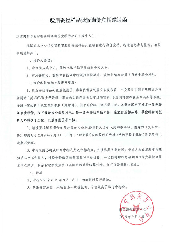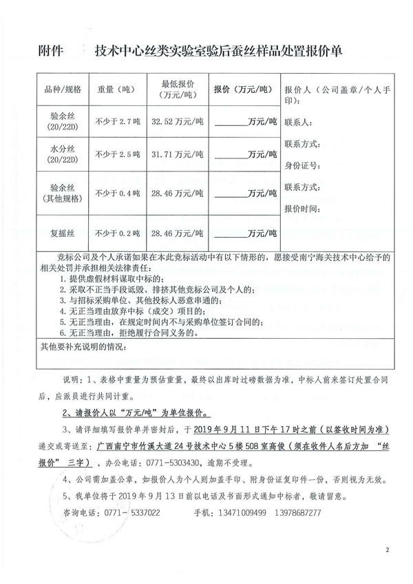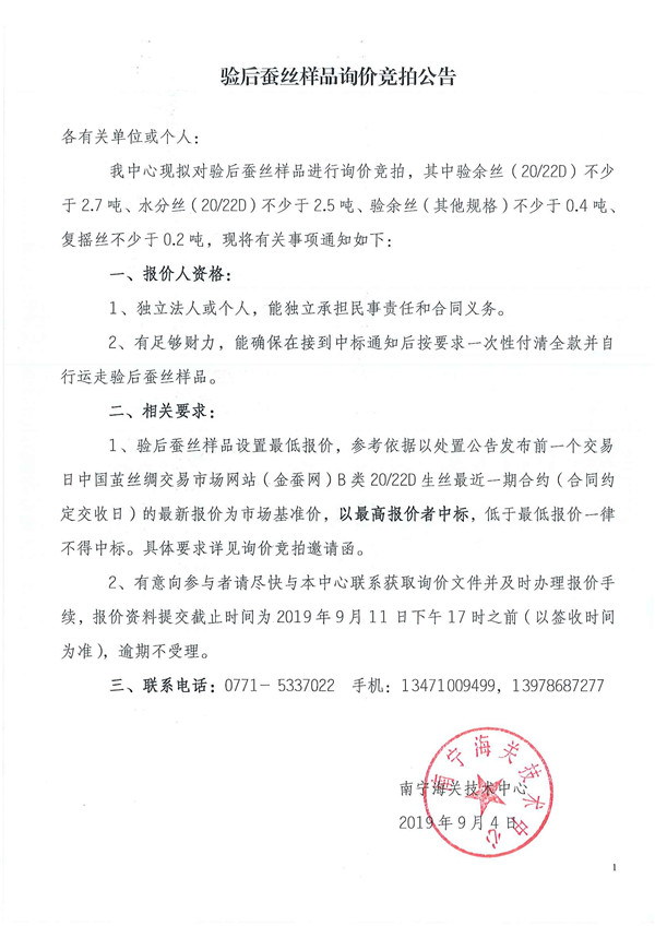 南寧海關(guān)技術(shù)中心關(guān)于驗后蠶絲樣品詢價競拍的公告