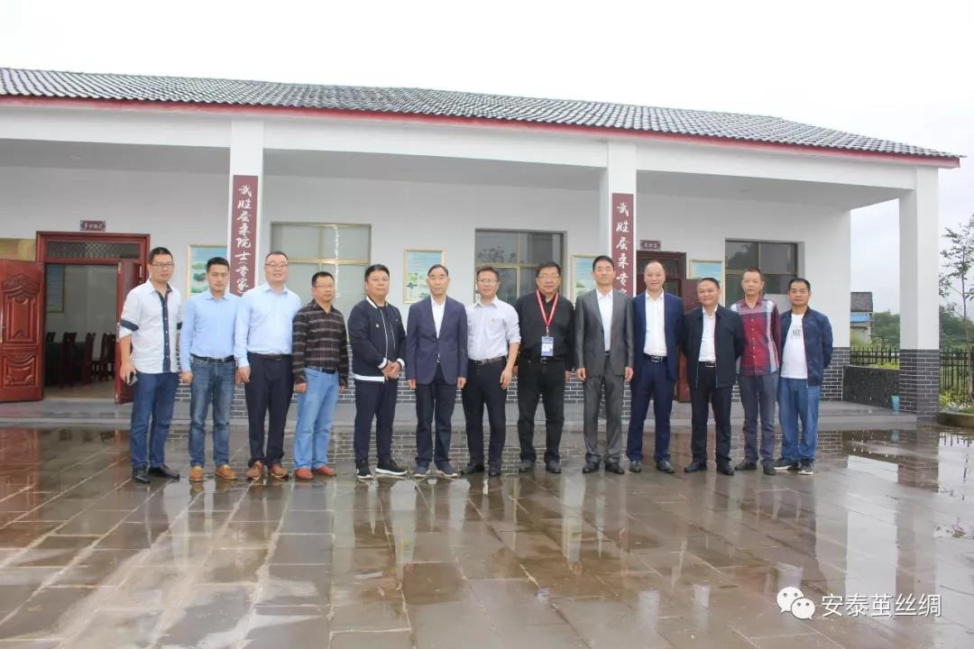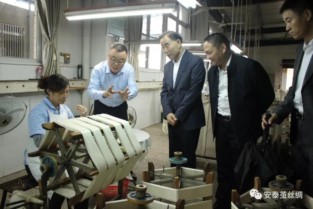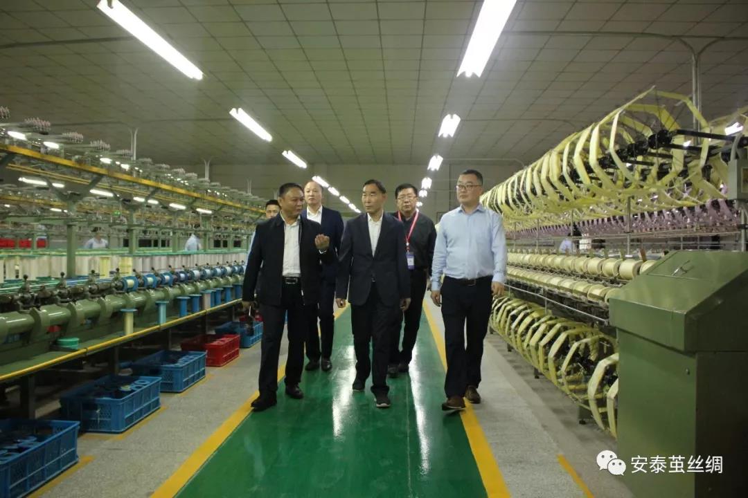 朱保成一行參觀了安泰工業(yè)園內(nèi)的繅絲生產(chǎn)車間、織綢生產(chǎn)車間、絲綢文化博覽館,考察了安泰繭絲綢集團建設(shè)的猛山、雙星現(xiàn)代化蠶桑產(chǎn)業(yè)基地、蠶桑專家大院。世紀(jì)安泰集團總裁陳善東對公司理念及發(fā)展現(xiàn)狀做了介紹:世紀(jì)安泰是以絲綢生產(chǎn)經(jīng)營為主導(dǎo)產(chǎn)業(yè),以房地產(chǎn)開發(fā)建設(shè)、星級酒店經(jīng)營、物業(yè)管理、金融及投資、教育醫(yī)療康養(yǎng)等為主要業(yè)務(wù)的集團化公司。安泰繭絲綢集團踐行“建萬畝良桑,做責(zé)任安泰”的使命,創(chuàng)新模式,積極與政府合作發(fā)展蠶桑產(chǎn)業(yè),投資近2億元在全縣8個鄉(xiāng)鎮(zhèn)自建1萬畝優(yōu)質(zhì)蠶?;亍⑤椛鋷影l(fā)展2萬畝優(yōu)質(zhì)桑園。公司嚴(yán)把質(zhì)量關(guān),生絲質(zhì)量達到6A級,生絲、熟綢產(chǎn)品遠銷歐洲客戶;公司將逐步從蠶繭生產(chǎn)、繅絲織綢、煉染,到服裝制造銷售等環(huán)節(jié),打造絲綢產(chǎn)品全產(chǎn)業(yè)鏈。