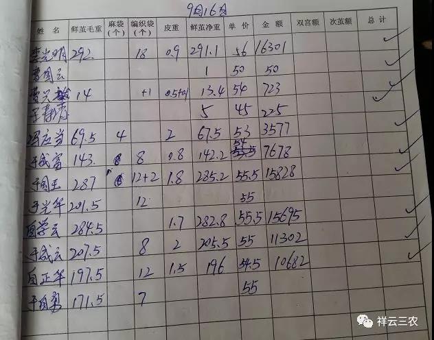 劉廠鎮(zhèn)王府山蠶繭收購站,來自蠶桑新發(fā)展區(qū)東山鄉(xiāng)妙姑村的自學(xué)云戶,秋蠶飼養(yǎng)13張、第一次售鮮蠶繭313公斤、單價(jià)56元/公斤、售繭收入17528元,第二次售鮮蠶繭286公斤、單價(jià)55.5元/公斤、售繭收入15873元,售秋蠶繭收入共計(jì)33401.00元。余乘云戶,飼養(yǎng)秋蠶5張、售鮮蠶繭207.5公斤,售價(jià)55元/公斤,售秋蠶繭收入11412.5元。