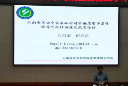 云南省農業(yè)科學院蠶桑蜜蜂研究所的白興榮專家作《云南蠶區(qū)58個家蠶品種對家查質型多角體病毒的抗性調查及聚類分析》