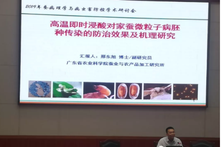 廣東省農業(yè)科學院蠶業(yè)與農產品加工研究所的邢東旭專家作《高溫即時浸酸對家蠶微粒子病胚種傳染的防治作用及機理研究》