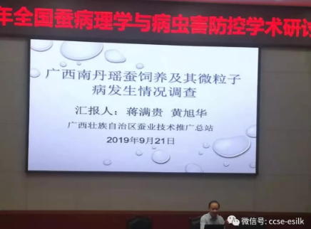 廣西壯族自治區(qū)蠶業(yè)技術推廣總站的蔣滿貴專家作《廣西南丹瑤蠶飼養(yǎng)及其微粒子病發(fā)生情況調查》