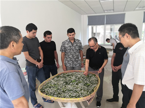 嘉興市蠶桑技術人員與烏茲別克斯坦蠶桑絲綢技術人員一起在養(yǎng)蠶現場進行交流