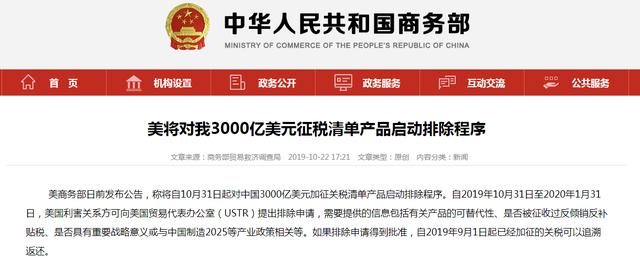 商務(wù)部:美將對我3000億美元征稅清單產(chǎn)品啟動排除程序
