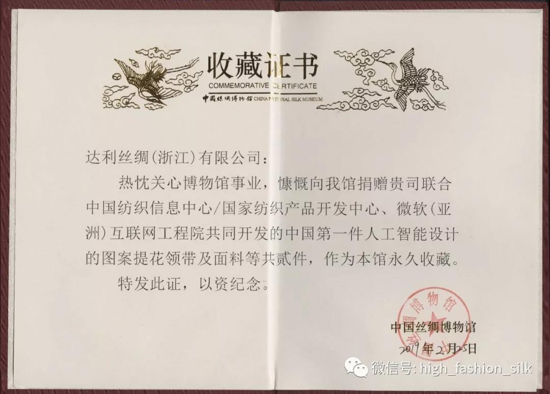 2018年8月18日全球第一款人工智能設(shè)計的絲綢面料在達利絲綢誕生,同年9月26日由中紡聯(lián)國家紡織信息中心在上海虹橋國家會展中心隆重發(fā)布,同年12月25日全球第一款人工智能設(shè)計的絲綢面料由中國絲綢博物館發(fā)布與永久收藏。