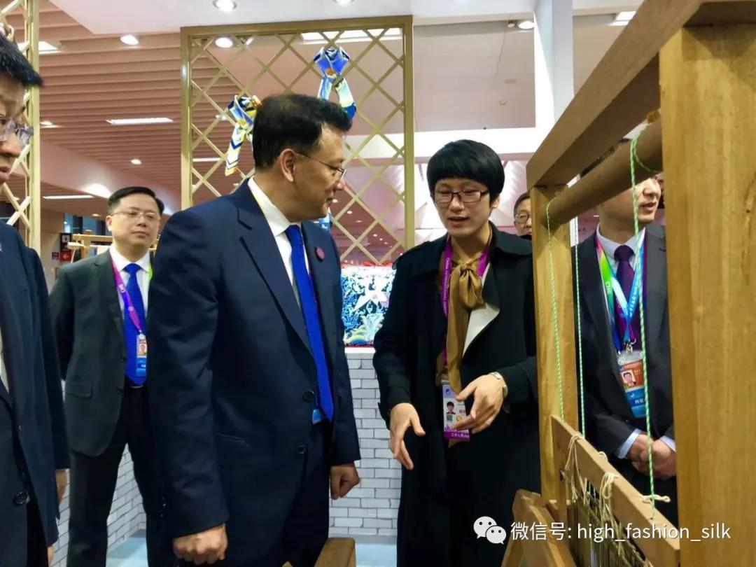 今天浙江省省長袁家軍蒞臨我司展位考察。中國十佳面料設(shè)計師,全球首次利用人工智能進行絲綢面料設(shè)計的設(shè)計師丁園園向袁省長介紹達利絲綢的面料人工智能設(shè)計系統(tǒng)。