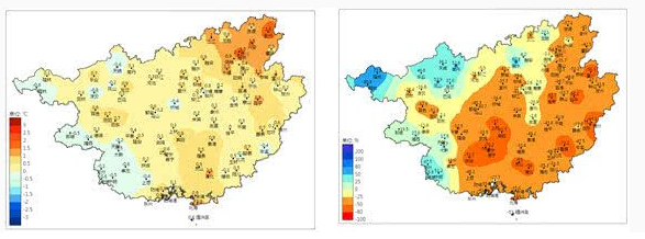 2019年9月1日-11月5日廣西各地溫度距平和降雨量距平百分率圖