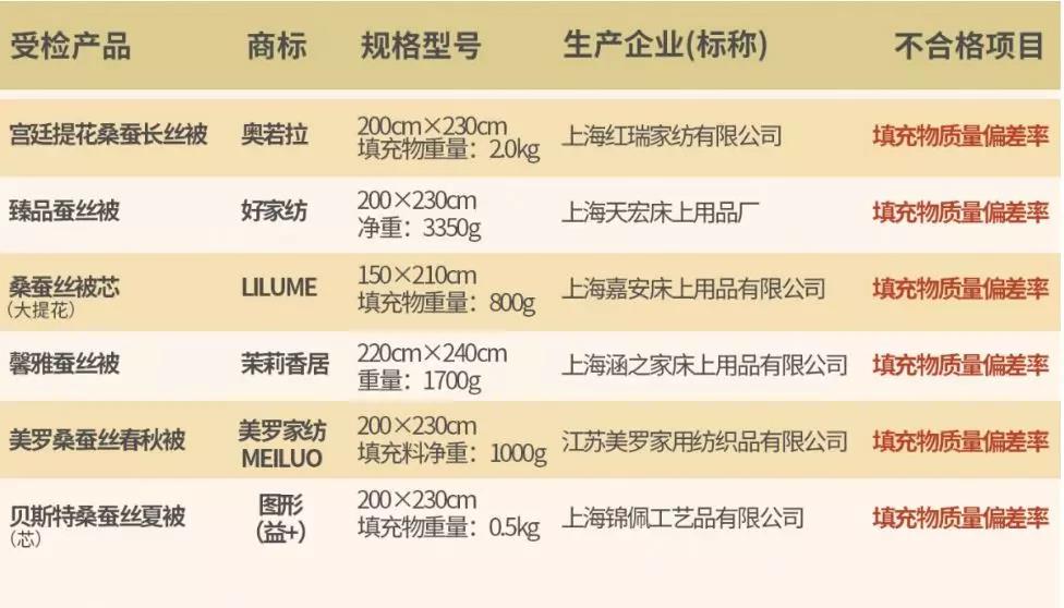 本次抽查中,有6批填充物質(zhì)量偏差率不符合國家標(biāo)準(zhǔn)要求,不合格樣品中,最大的偏差為-40.7%,有短斤缺兩欺騙消費(fèi)者嫌疑。包括:“奧若拉”宮廷提花桑蠶長絲被、“好家紡”臻品蠶絲被、“LILUME”桑蠶絲被芯(大提花)、“茉莉香居”馨雅蠶絲被、“美羅家紡 MEILUO”美羅桑蠶絲春秋被、“圖形(益+)”貝斯特桑蠶絲夏被(芯)。