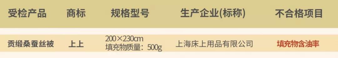 此外,含油率也是蠶絲被內(nèi)在質(zhì)量考核指標(biāo),如果含油率過高,絲綿容易變質(zhì)而產(chǎn)生異味、變硬的情況,此次抽檢“上上”貢緞桑蠶絲被含油率達(dá)不到標(biāo)準(zhǔn)要求。