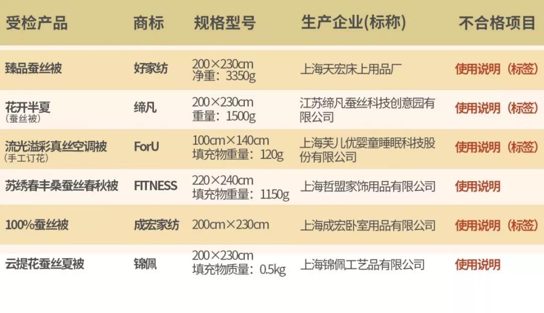 而這次抽查中,有6批產(chǎn)品的標(biāo)簽存在信息不全,沒有按照國家標(biāo)準(zhǔn)規(guī)定標(biāo)注的情況。包括:“好家紡”臻品蠶絲被、“締凡”花開半夏(蠶絲被)、“ForU”流光溢彩真絲空調(diào)被(手工訂花)、“FITNESS”蘇繡春豐桑蠶絲春秋被、“成宏家紡”100%蠶絲被、“錦佩”云提花蠶絲夏被。