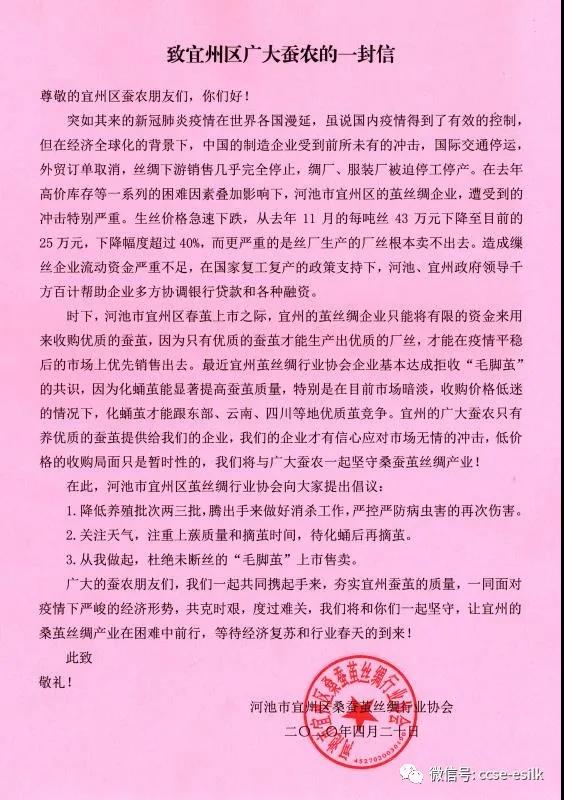 廣西河池市宜州區(qū)桑蠶繭絲綢行業(yè)協(xié)會致蠶農(nóng)的公開信