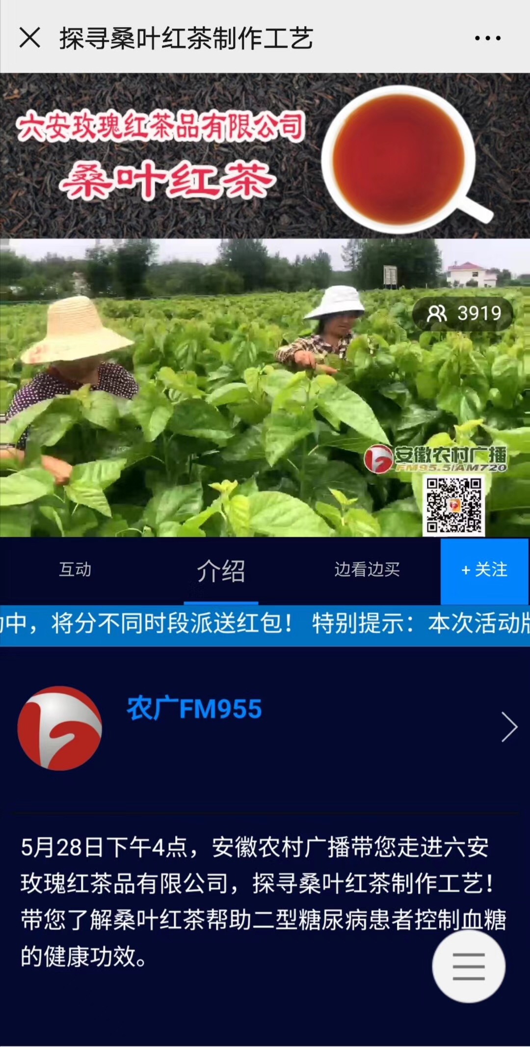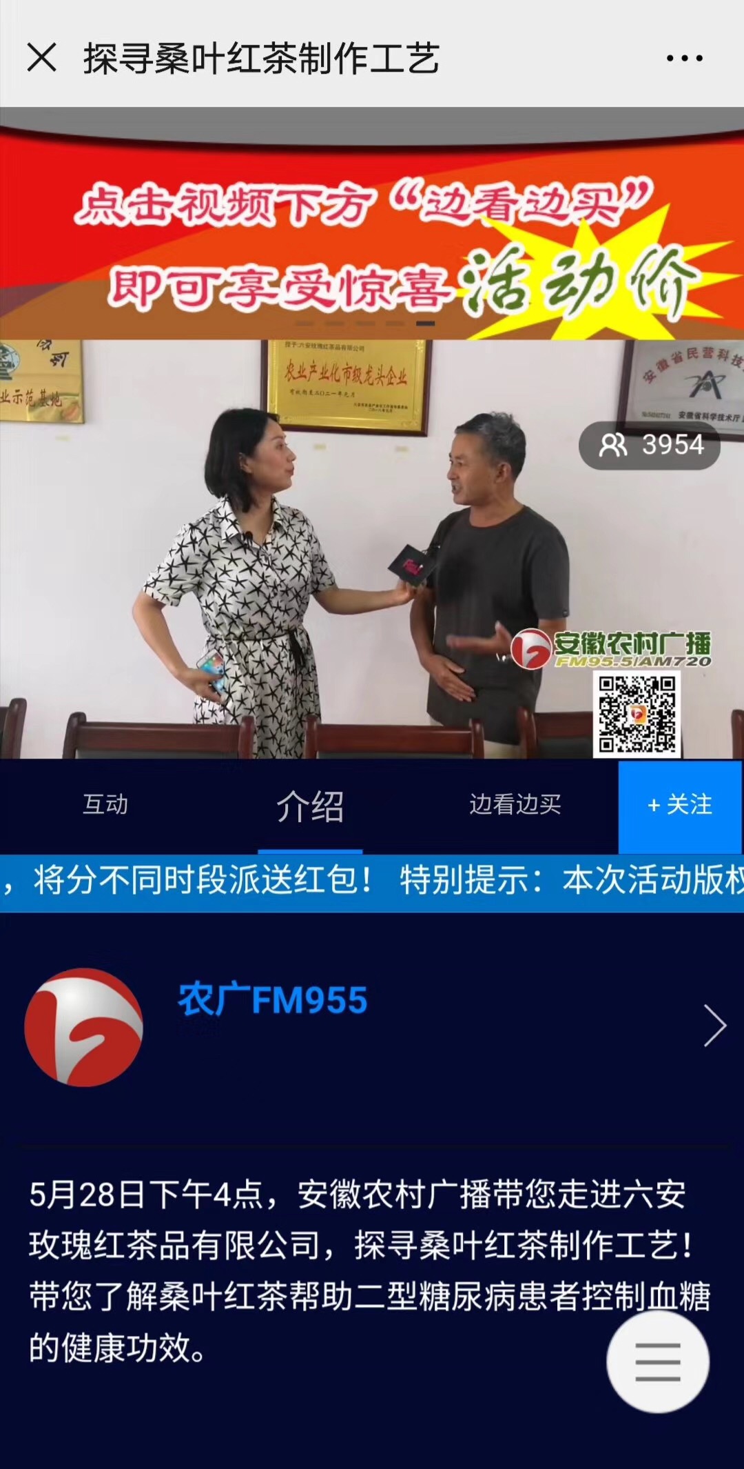 2020年5月28日,安徽電視臺(tái)農(nóng)村廣播節(jié)目組親臨六安玫瑰紅茶品有限公司,探尋桑葉紅茶制作工藝,開啟桑葉紅茶“農(nóng)民服務(wù)臺(tái)”云直播銷售,讓廣大消費(fèi)者特別是紅茶愛好者了解桑葉紅茶制作工藝、降糖機(jī)理,邊看邊買。