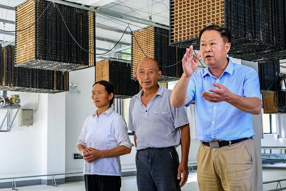 養(yǎng)蠶大戶王科來家的養(yǎng)蠶室,極具現(xiàn)代化氣息,人可以坐在電動喂蠶車上面撒葉喂食,熟蠶將上簇時,吊在空中的方格簇直接垂下,熟蠶就可以爬上去吐絲作繭,節(jié)省大量的人力物力。