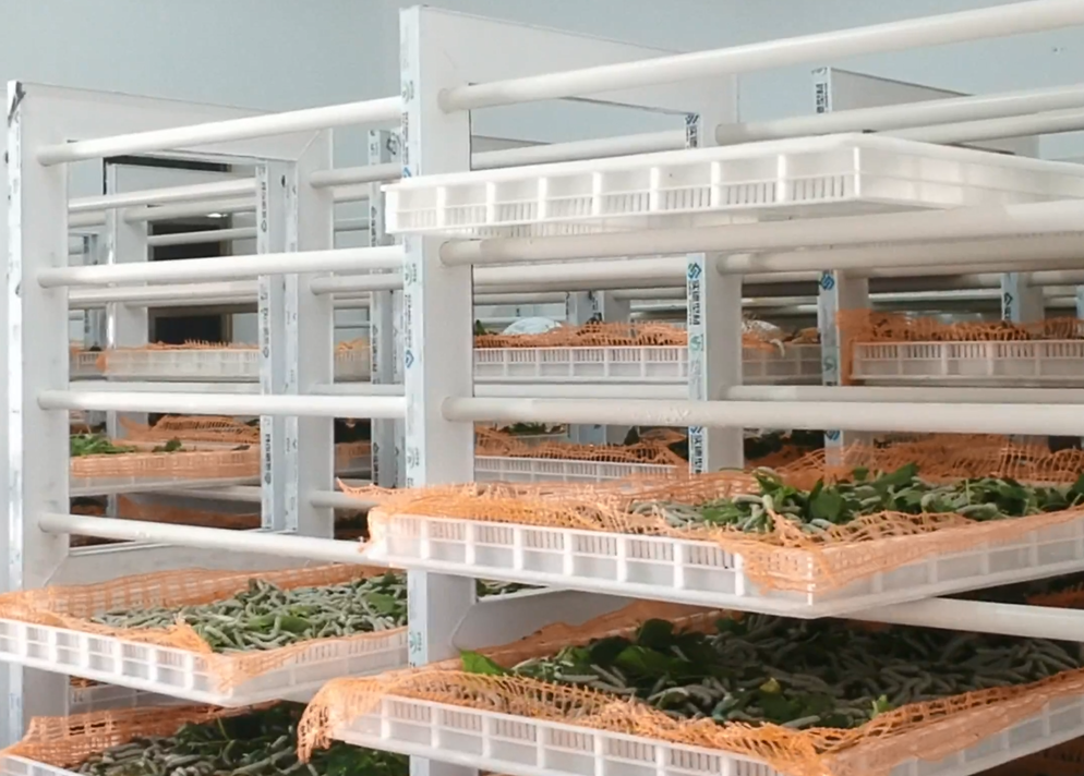 胖嘟嘟的蠶寶寶蠕蠕爬動,或爭相撲在桑葉上,或立起脖子探出頭來,待找到滿意舒適的地方,便貪婪地吮吸著桑葉里的養(yǎng)分……作響的“沙沙沙”聲,仿佛初夏里一首動聽悅耳的樂曲。這里是位于廣東省英德市浛光鎮(zhèn)鎮(zhèn)南村的現(xiàn)代化蠶桑養(yǎng)殖基地,在外面接近36度的高溫下,蠶房里的蠶寶寶們正吹著涼快的空調(diào)茁壯成長。
