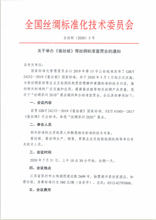 全國絲綢標準化技術(shù)委員會關(guān)于舉辦《蠶絲被》等絲綢標準宣貫會的通知