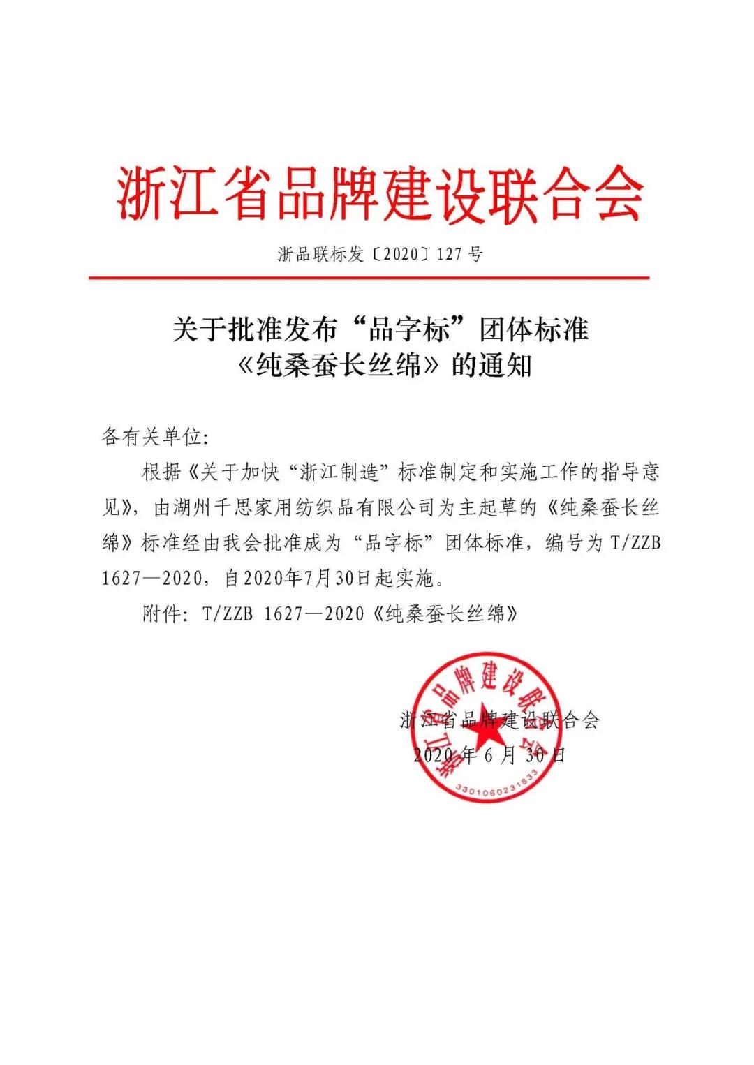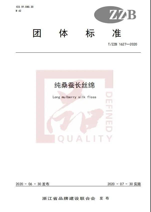 《純桑蠶長絲綿》“品字標”團體標準由湖州千思家用紡織品有限公司為主起草制定,標準編號為T/ZZB 1627—2020,自2020年7月30日起實施。