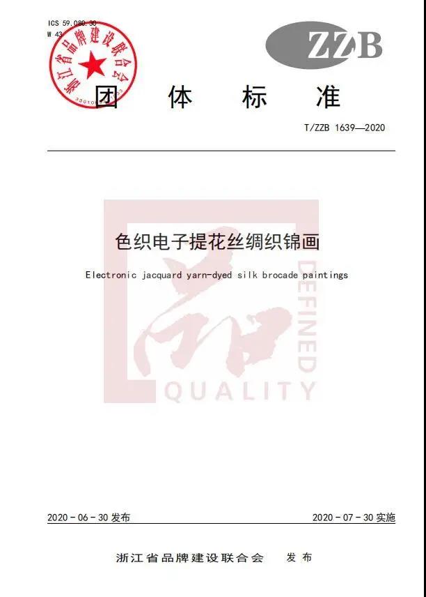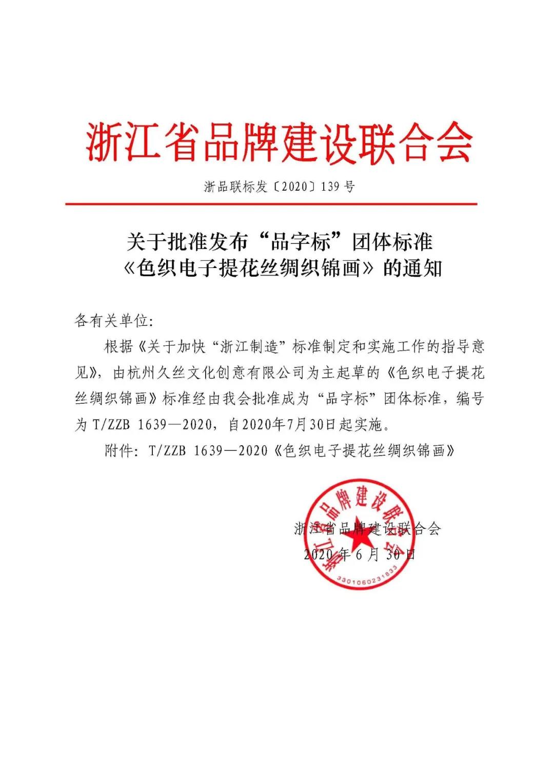 《色織電子提花絲綢織錦畫》“品字標”團體標準由杭州久絲文化創(chuàng)意有限公司為主起草制定,標準編號為T/ZZB 1639—2020,自2020年7月30日起實施。