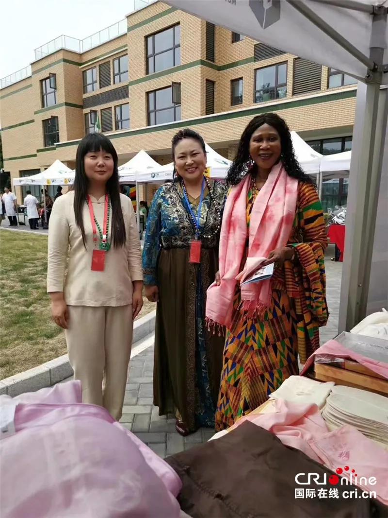 偉富實(shí)業(yè)總經(jīng)理王麗娟推介柞蠶絲綢并與英聯(lián)邦北京協(xié)會副主席那媛(中)等國際友人合影