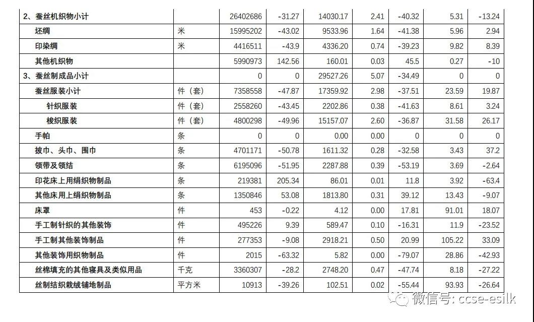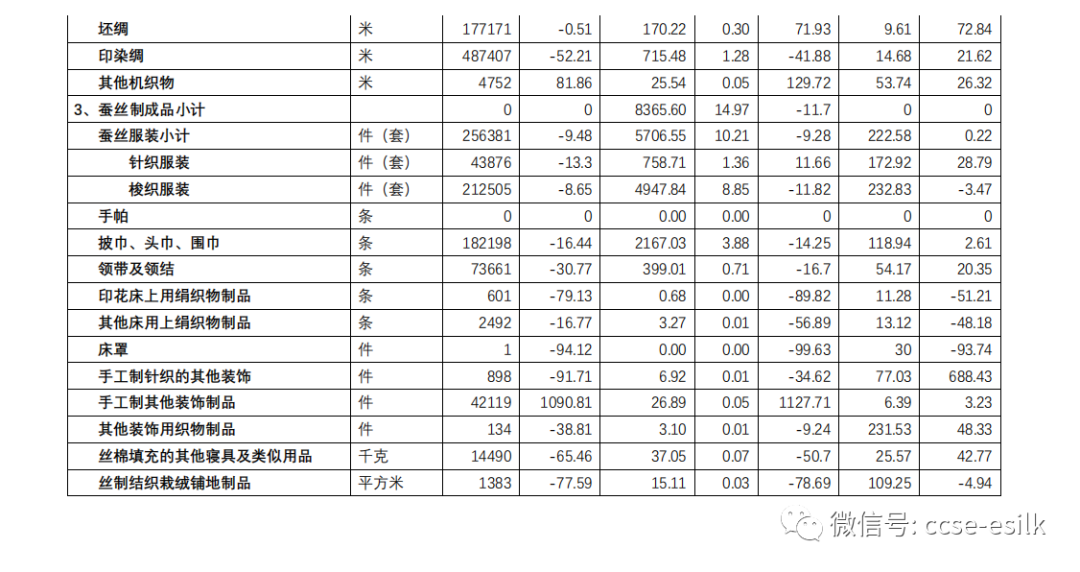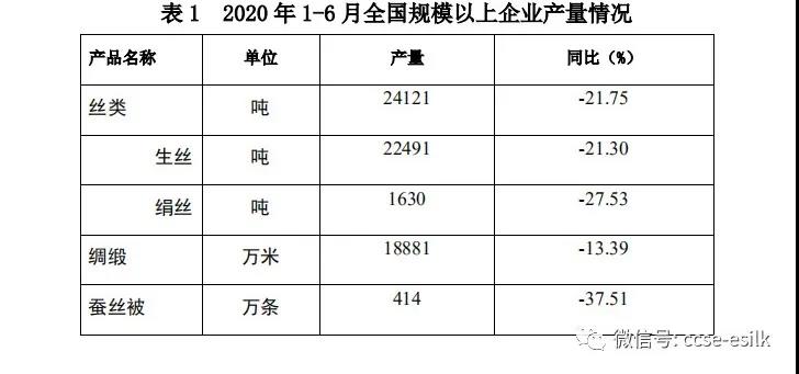 1-6 月,全國蠶絲產(chǎn)量 24121 噸,同比下降 21.75%。其中,生絲產(chǎn)量 22491 噸,同比下降 21.30%;絹紡絲產(chǎn)量 1630 噸,同比下降 27.53%。綢緞產(chǎn)量 18881 萬米,同比下降 13.39%。蠶絲被產(chǎn)量 414萬條,同比下降 37.51%。