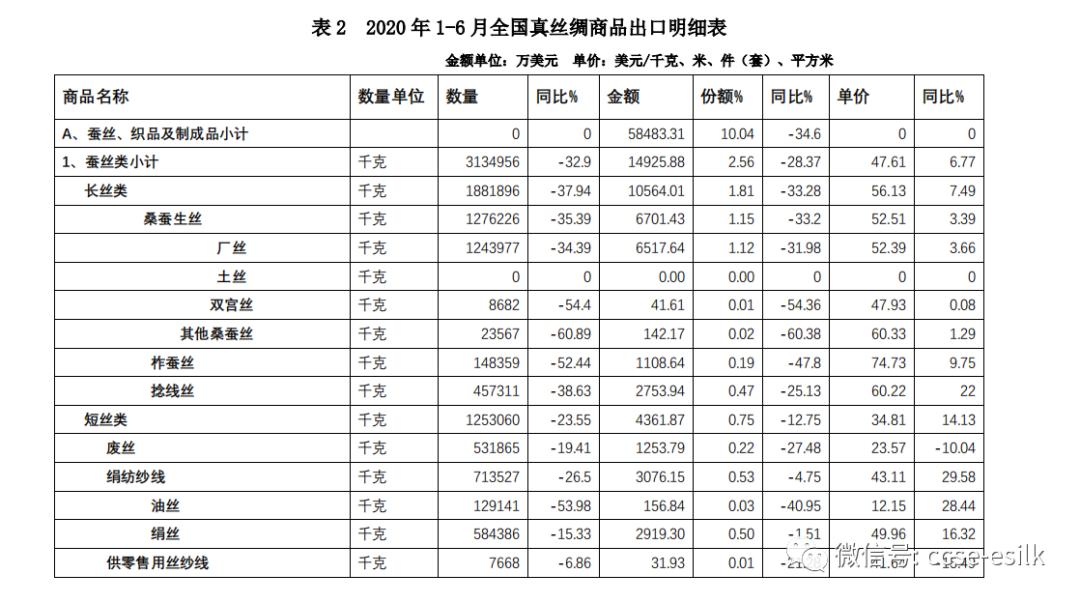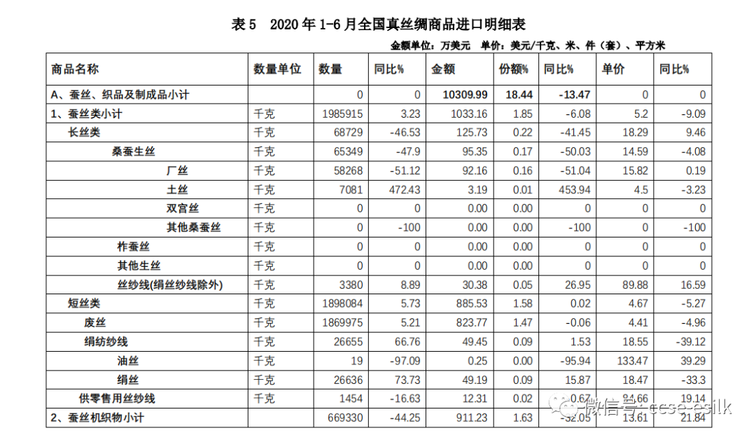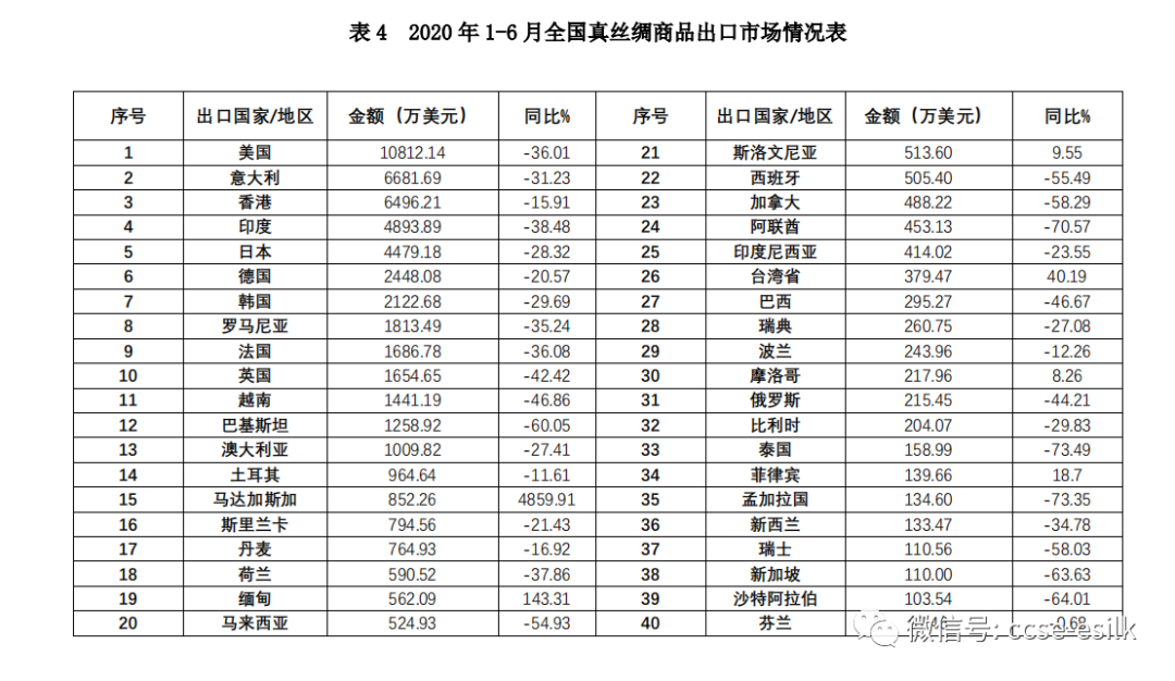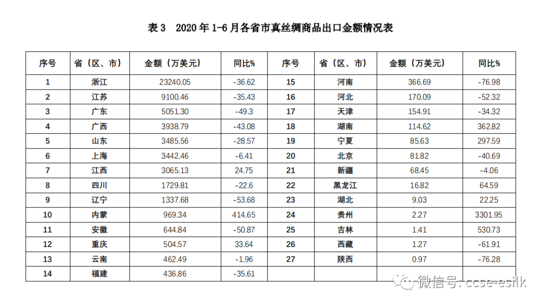 據(jù)中國海關(guān)統(tǒng)計,1-6月全國真絲綢商品出口總額5.85億美元,同比下降34.6%。1-6月全國真絲綢商品進口總額10310萬美元,同比下降 13.47%。具體情況詳見表2、表3、表4、表5。