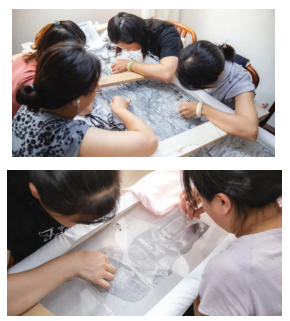 ▲繡娘與常沙娜《花開(kāi)敦煌》合作絲綢作品在法國(guó)展出