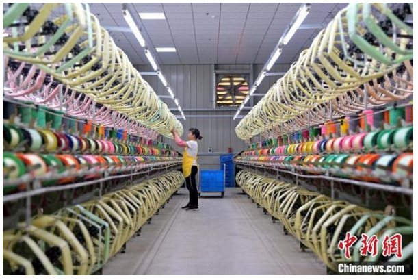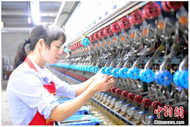工人在廣西那坡同益新絲綢科技有限公司生產(chǎn)線上工作