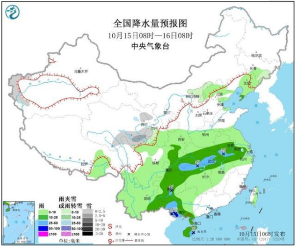 10月16日08時至17日08時,新疆南疆西部山區(qū)、黑龍江西北部、吉林東部、青海東南部等地部分地區(qū)有小雪或雨夾雪,局地有中到大雪。西北地區(qū)東南部、黃淮東部、江淮、江漢大部、江南大部、西南地區(qū)大部、海南島、臺灣島大部等地部分地區(qū)有小到中雨,其中,海南島東部、臺灣島東北部有大雨或暴雨。內(nèi)蒙古河套地區(qū)、青海西部等地部分地區(qū)有4~6級風。