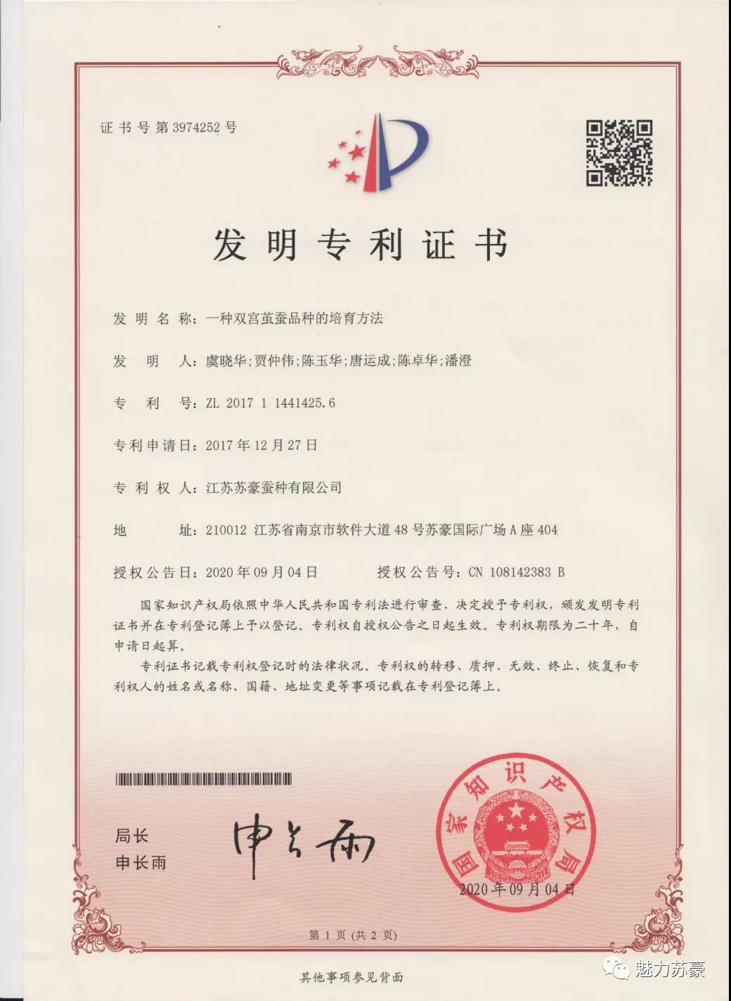 2015年,蘇豪蠶種公司開(kāi)始進(jìn)行“雙宮繭”蠶品種的選育開(kāi)發(fā)工作,經(jīng)過(guò)5年的努力,2020年6月育成了中國(guó)第一個(gè)“雙宮繭”蠶品種“天宮×明月”(暫定名),2020年9月《一種雙宮繭蠶品種培育方法》獲得了國(guó)家知識(shí)產(chǎn)權(quán)局授予國(guó)家發(fā)明專利證書(shū)。