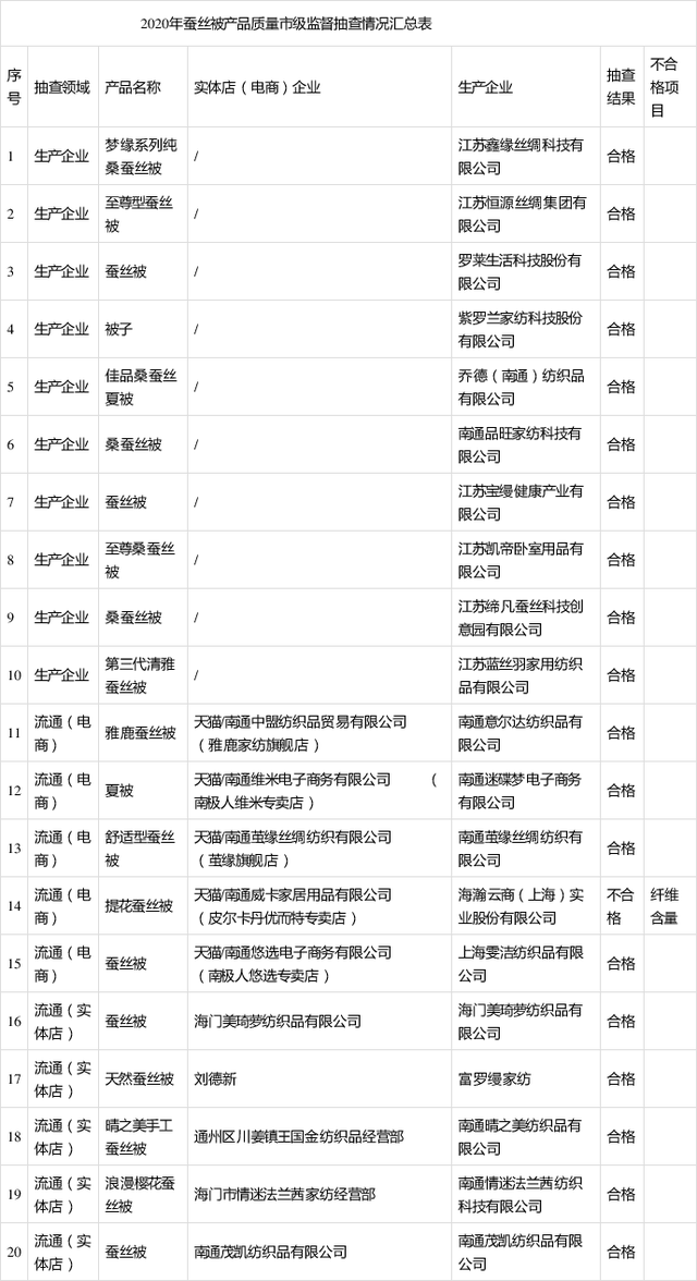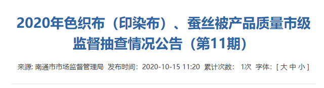 10月15日,江蘇南通市市場(chǎng)監(jiān)督管理局官網(wǎng)發(fā)布公告稱,2020年南通市市場(chǎng)監(jiān)督管理局對(duì)色織布(印染布)、蠶絲被產(chǎn)品質(zhì)量實(shí)施了監(jiān)督抽查,其中抽查色織布(印染布)23批次,全部合格;抽查蠶絲被20批次,1批次不合格,問(wèn)題發(fā)現(xiàn)率5%。