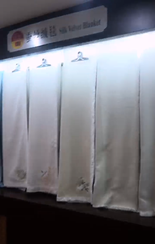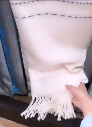 直播主播一人,鏡頭對準樣品,主播不出鏡。直播地點為樣品間。展品分為兩部分,毯子和披肩。主播從入門口的樣品依次往里介紹。展出的毯子有蠶絲毯、竹棉毯、羊毛毯、棉晴毯、棉童毯等。華帛公司由生產(chǎn)蠶絲毯起家,首先介紹的蠶絲絨毯之前出口日本、美國,純色,做了包邊設計,大尺寸并且接受尺寸定做。竹纖維毛毯分為無拉絨和輕拉絨兩種。披肩有100%竹纖維的格子披肩,也可做素色,有卷邊,兩端有流蘇,流蘇分為打結和不打結兩種。羊毛披肩為素色,同樣帶有流蘇,手感柔軟。棉腈披肩可由自有提花機提花,花型尺寸都可定做,有拉毛款和無拉毛款兩種,拉毛款比較厚實。