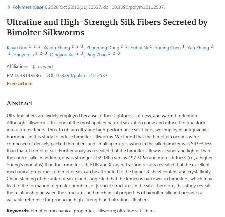 盡管蠶絲是應用最廣泛的天然絲纖維之一,但它直徑較粗,難以達到超細纖維。因此,為了獲得超細的高性能蠶絲纖維,研究者使用抗保幼激素誘導三眠蠶品種獲得了二眠蠶。結果表明,二眠蠶繭由緊密堆積的超細纖維組成,其蠶絲直徑比三眠蠶絲的直徑小54.9%。進一步的分析表明,二眠蠶絲比對照三眠蠶絲具有更高的潔凈度,且更輕盈。此外,二眠蠶絲比三眠蠶絲具有更高的強度和剛度。FTIR和X射線衍射結果表明,二眠蠶絲的優(yōu)異機械性能可歸因于較高的β-折疊含量和結晶度。前部絲腺的幾丁質染色表明,二眠蠶絲腺內腔顯著變窄,這可能導致絲蛋白受到更強的剪切力從而形成了更多的β-折疊結構。這項研究揭示了二眠蠶絲結構與力學性能之間的關系,并為生產(chǎn)高強度和超細絲纖維提供了有價值的參考。