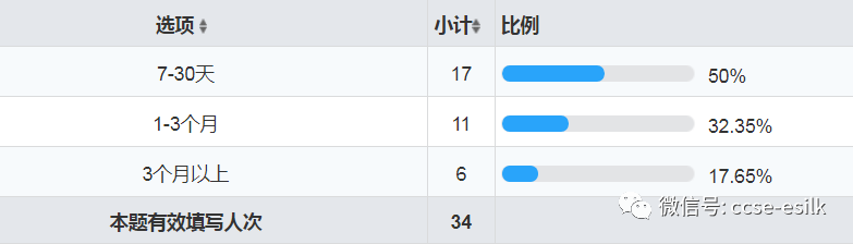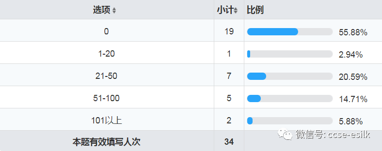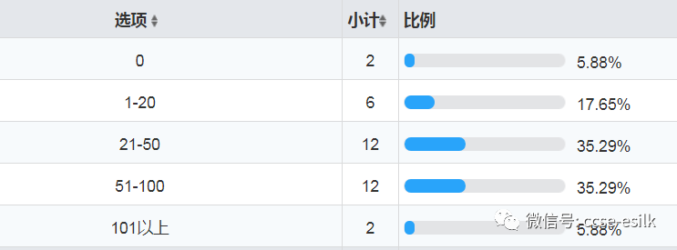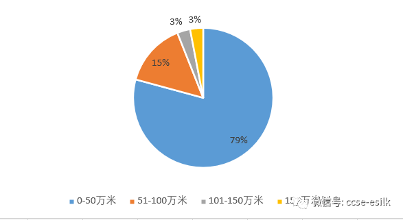 選擇0-50萬米的為27家,51-100萬米的為5家,101到150萬米的為1家,151萬米以上的為1家。