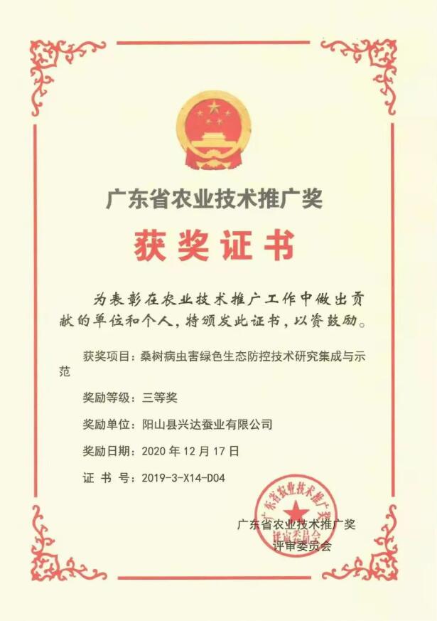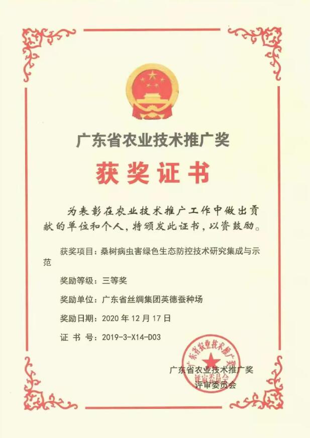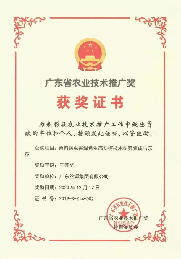 近日,廣東省絲綢紡織集團(tuán)有限公司所屬廣東絲源集團(tuán)有限公司、廣東省絲綢集團(tuán)英德蠶種場(chǎng)、陽山縣興達(dá)蠶業(yè)有限公司“桑樹病蟲害綠色生態(tài)防控技術(shù)研究集成與示范項(xiàng)目”獲廣東省農(nóng)業(yè)農(nóng)村廳頒發(fā)2020年廣東省農(nóng)業(yè)技術(shù)推廣獎(jiǎng)。