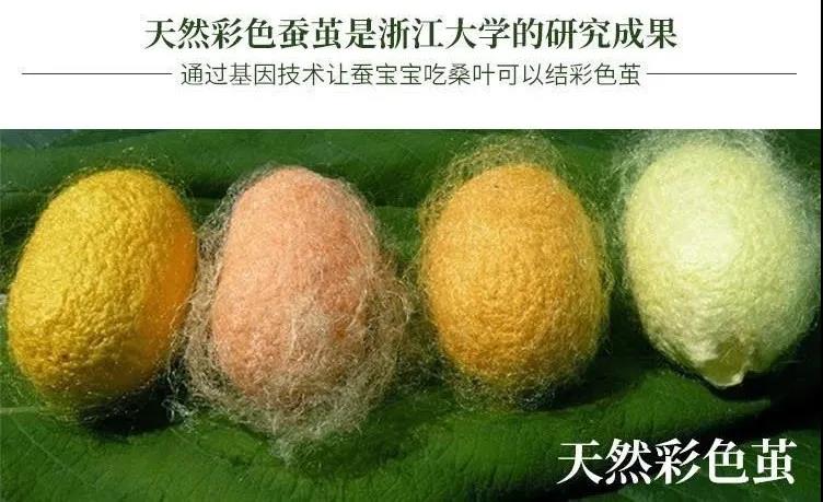 吐彩絲的蠶寶寶,包含天然抗菌型黃金繭新品種:金秋×初日。這是全國第一個推廣階段的實用型彩色蠶繭,由浙江大學(xué)通過基因技術(shù),培育而出。